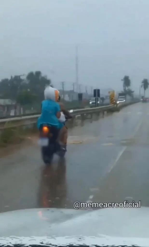 O vídeo publicado nas redes sociais mostra uma mulher na garupa de uma moto durante a chuva usando uma sacola plástica por cima do capacete. Nas imagens postadas pela página @memeacreoficial, o internauta se surpreende com a forma que a mulher achou de se proteger da chuva.