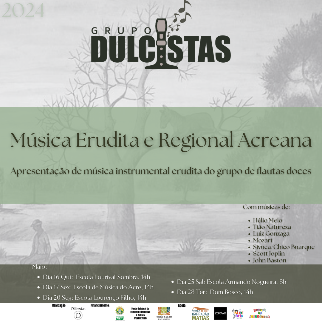 O projeto “Dulcistas – Música Erudita e Regional Acreana” tem como objetivo difundir a cultura musical, tanto erudita quanto regional, em escolas públicas de Rio Branco. O grupo Dulcistas traz uma série apresentações com arranjos de músicas que vão do período barroco até os dias atuais, além de músicas regionais, executada exclusivamente com flautas doces. Essas apresentações valorizam a cultura regional e enriquece a experiência do público com a sonoridade das flautas doces.
