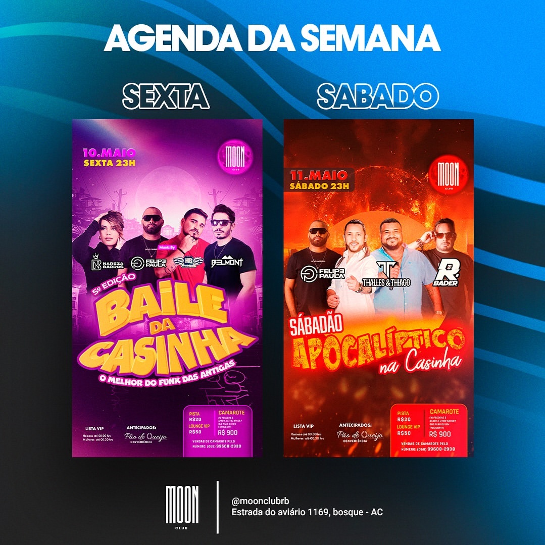 Para aqueles que gostam de uma baladinha, o point essa semana é lá na Moon Club, onde o fim de semana começa já na sexta-feira (10), com a 5ª edição do Baile da Casinha. Para aqueles que estão com uma energia mais caótica, o sábadão apocalíptico da Moon vai ser a pedida certa!