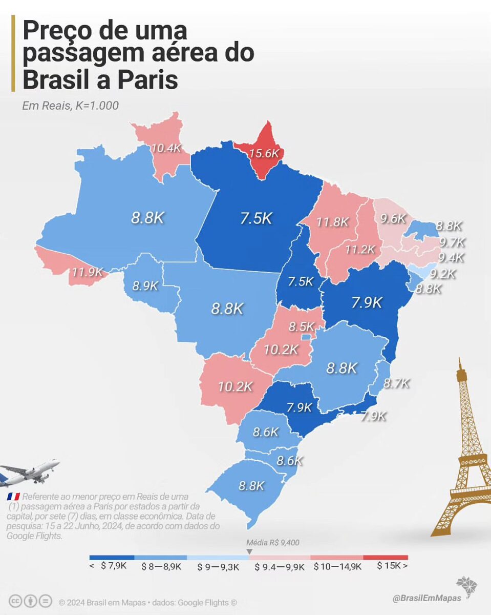 O preço médio nacional para uma passagem a Paris está em torno de R$ 9.400. Capitais como Rio de Janeiro e São Paulo apresentam preços ligeiramente abaixo da média, com valores de R$ 7.900 e R$ 7.960, respectivamente. Em contraste, as passagens aéreas a partir de locais com custos mais altos frequentemente incluem múltiplas conexões, o que contribui para o aumento do valor.