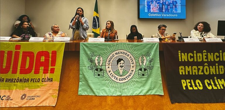 Já, Angela Mendes, ativista e presidenta do Comitê Chico Mendes, em seu discurso de encerramento da sessão de homenagem ao legado de seu pai, relembrou sobre o fazer coletivo em defesa da Amazônia, enfatizando a importância fundamental de se aliançar e do trabalho em conjunto.