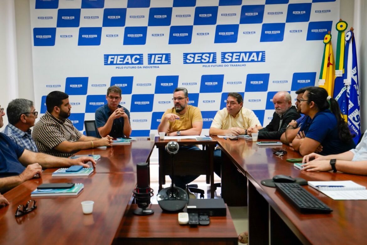 Nesta quarta-feira, 17, na Federação das Indústrias do Acre (FIEAC), o senador Alan Rick (União Brasil) se reuniu com representantes do Sindicato das Indústrias de Frigoríficos e Matadouros do Estado do Acre (Sindicarnes/AC), Murilo Leite e Nenê Junqueira, o coordenador da Unidade de Tecnologia da Alimentos (UTAL) da UFAC, Rui Sant’Ana de Menezes e representantes de diversas indústrias alimentícias acreanas.
