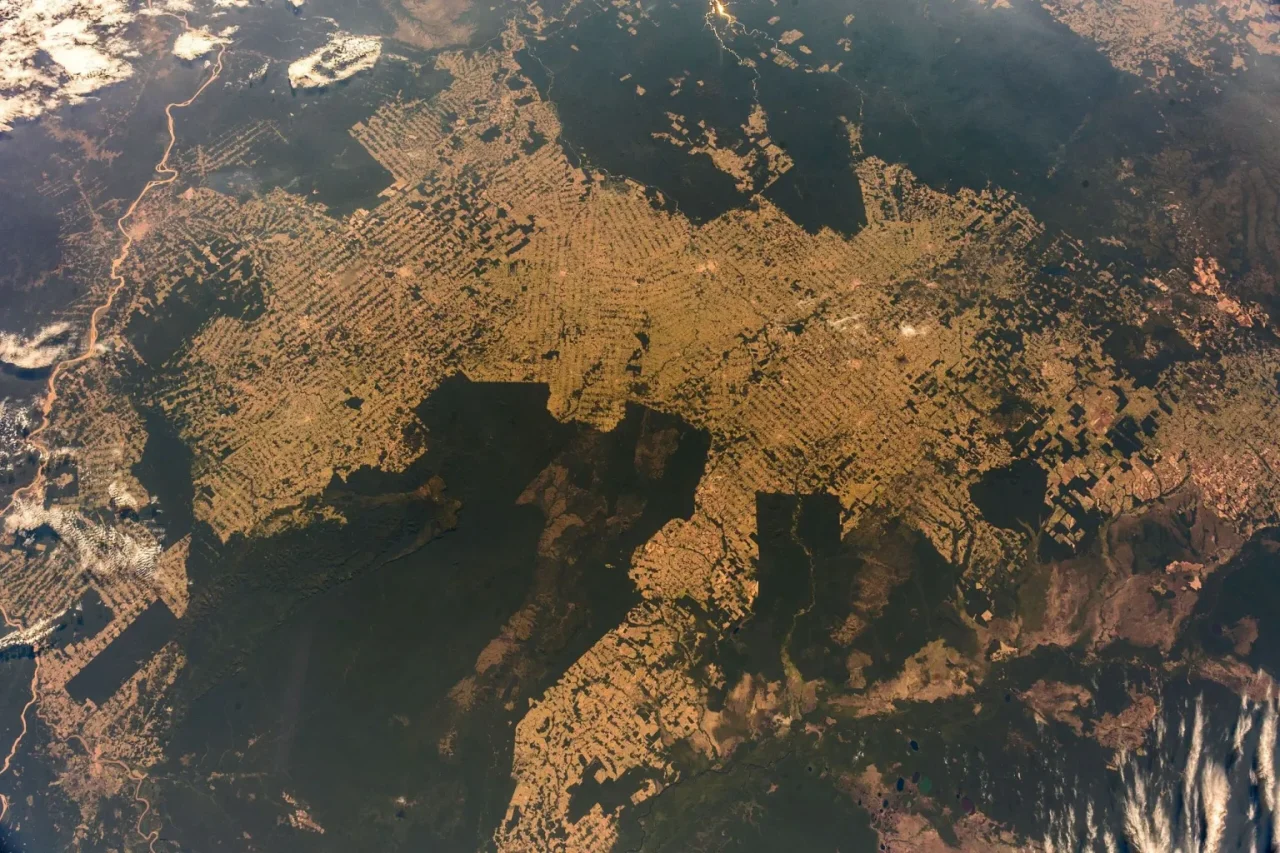 A floresta amazônica é chave no equilíbrio climático, conservação da biodiversidade e de culturas e povos tradicionais, mas segue sob franco desmatamento. Imagem: Credit: ESA/Alexander Gerst/Creative Commons