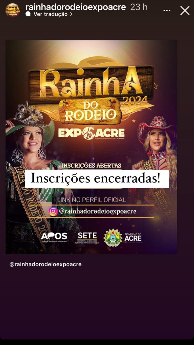 As inscrições para o 24º certame da Rainha do Rodeio da Expoacre 2024 foram oficialmente encerradas. O anúncio foi feito pelas redes sociais do concurso, que é organizado pelos colunistas sociais Roberta Lima e Gigi Hanan, da Associação dos Colunistas do Acre (Acos), com o apoio do governo do Acre, por meio da Secretaria de Turismo e Empreendedorismo (Sete).