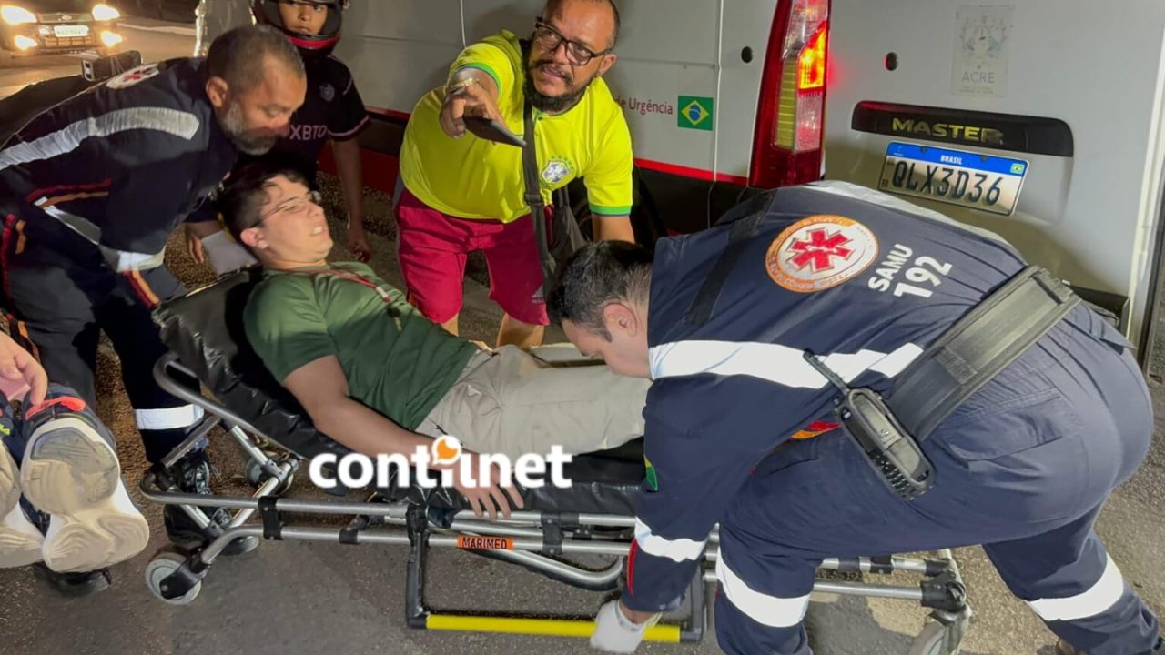 O entregador Alisson Magalhães Alves, 20 anos, ficou ferido após uma colisão entre uma motocicleta e um carro na noite deste sábado (20), na esquina do Pronto Socorro de Rio Branco, no cruzamento da Avenida Getúlio Vargas com a Avenida Nações Unidas, no bairro do Bosque.
