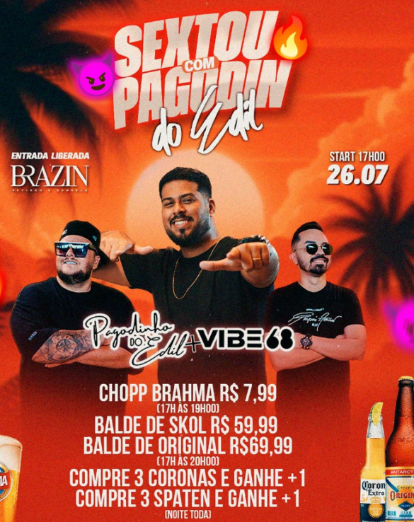 Seguindo na tradição, o Brazin continua com o Pagodinho do Edil na sexta-feira, e eles tão aceitando todo mundo, vai ter música pro apaixonado e pra quem levou um pé na bunda!