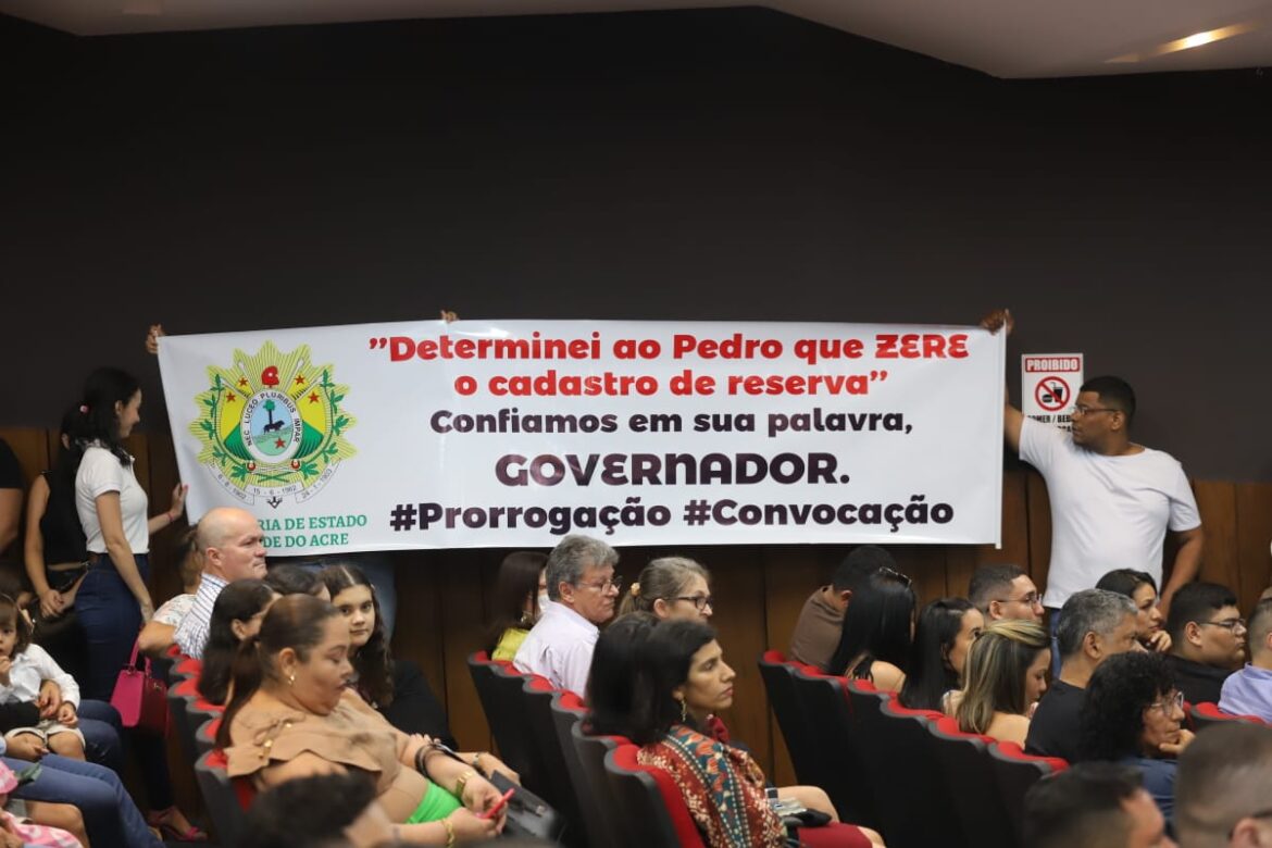Manifestantes aguardam ansiosamente enquanto o governador promete resolver a questão do cadastro de reserva durante evento na Sesacre/Foto: Reprodução