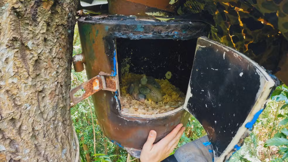 Filhote de papagaio de Porto Rico, batizado de “Globinho”, em ninho artificial — Foto: Reprodução/TV Globo