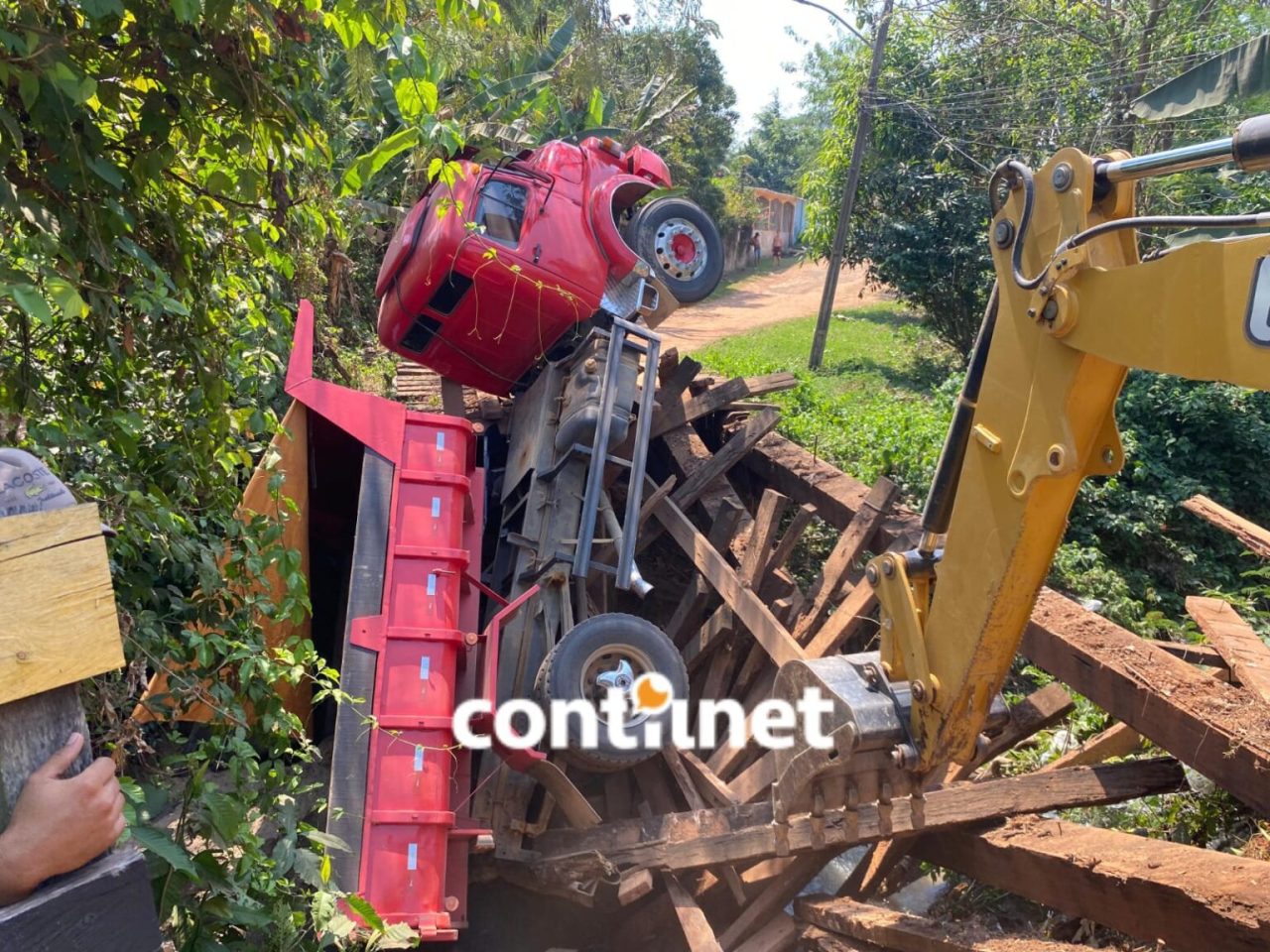 Uma ponte desabou na tarde desta segunda-feira (29) e uma caçamba foi parar dentro de um córrego na rua dos Diamantes, no bairro Xavier Maia, em Rio Branco.
