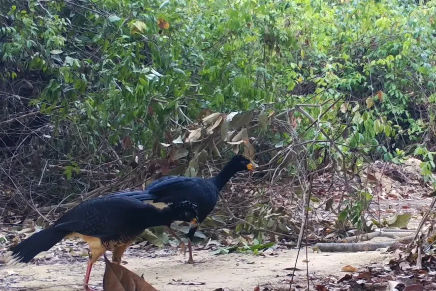 Casal de mutum-pinima registrado na armadilha fotográfica da Rebio do Gurupi. Em primeiro plano, a fêmea com seu corpo rajado. Registro inédito. Imagem: Monitoramento Rebio Gurupi/ICMBio