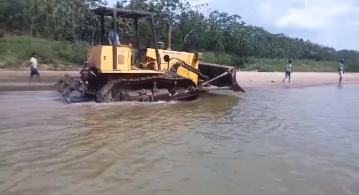 Um vídeo flagrou um trator de esteira atravessando o Rio Juruá, em Porto Walter, interior do Acre, na comunidade ribeirinha Vitória.