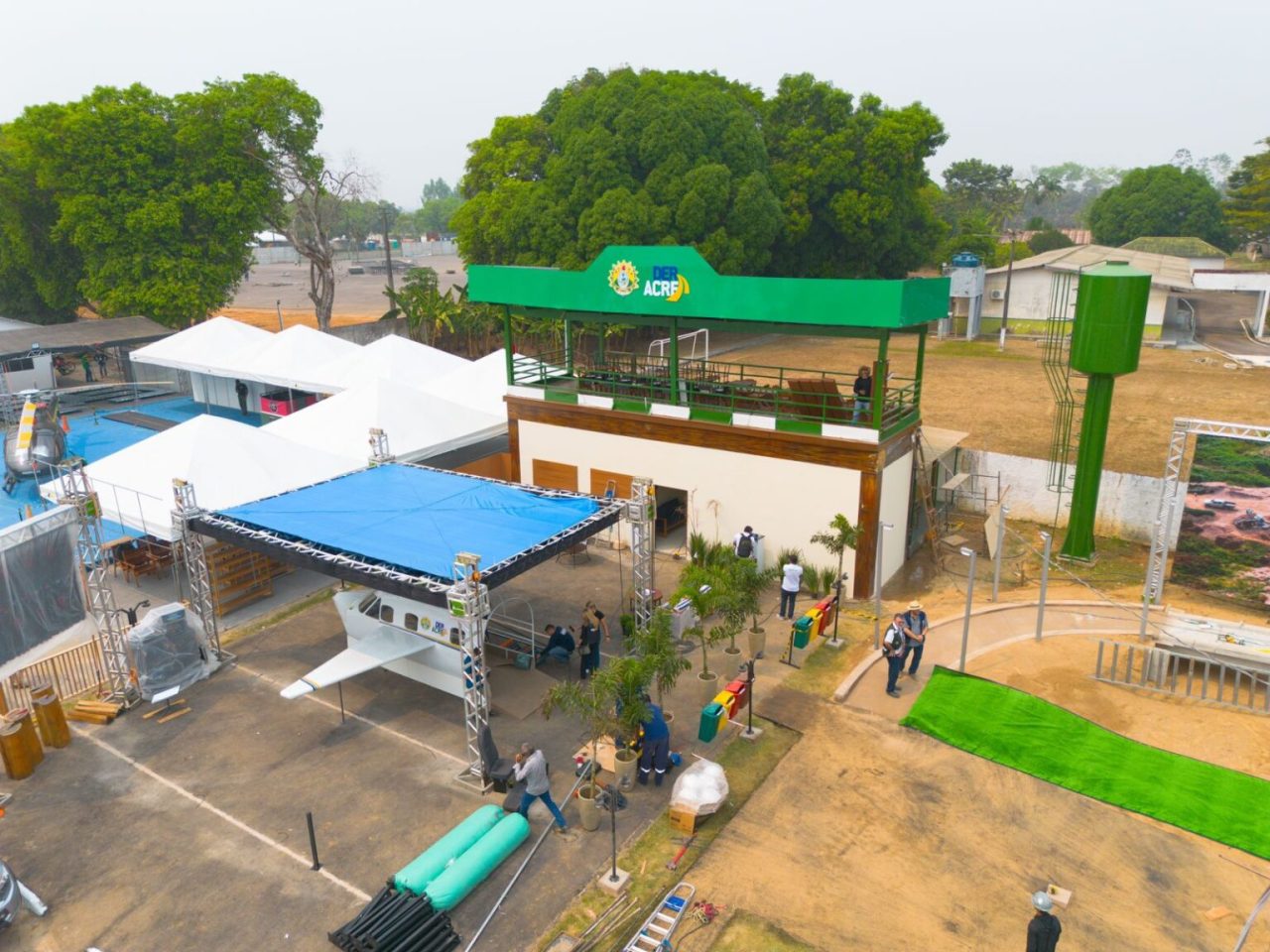 No estande, os visitantes podem conferir um lounge, uma ponte pré-moldada que simboliza a ponte Frei Paolino Baldassari, um avião que representa os 10 mil voos realizados nos aeródromos do Acre e um heliponto que destaca a importância da infraestrutura aérea.