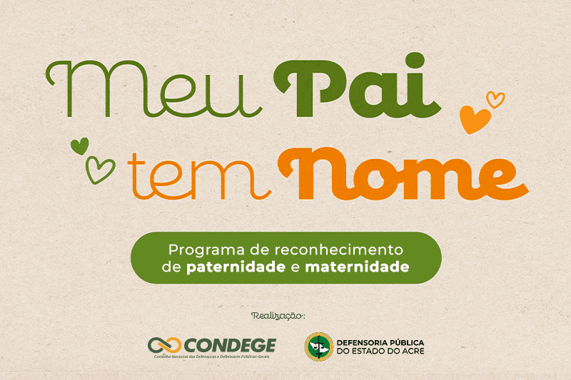 A Defensoria Pública do Estado do Acre (DPE/AC) realizará, neste sábado, 17, a terceira edição do programa nacional Meu Pai Tem Nome, que oferece assistência jurídica gratuita para reconhecimento de paternidade ou maternidade para crianças, adolescentes, jovens, adultos e pessoas idosas. Aproximadamente 700 pessoas estão participando, em Rio Branco e Cruzeiro do Sul, o atendimento do Dia D será voltado somente para quem fez a inscrição.