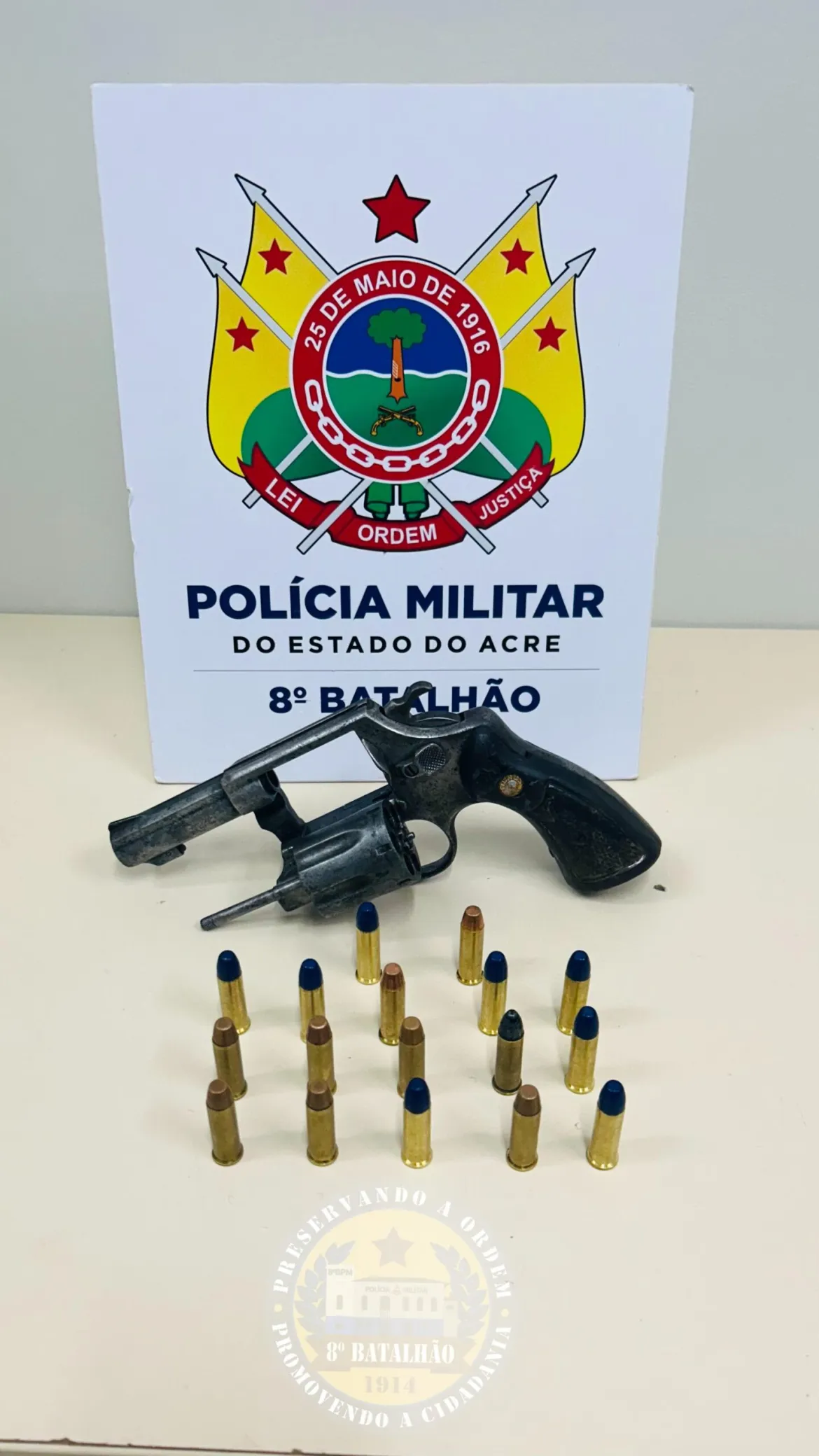 Ao ser realizada busca pessoal, os Militares encontraram em seu poder um revólver, calibre 38, com seis munições.Na sequência, foram encontradas mais 11 balas em seu bolso.