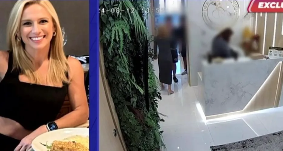 À esquerda, uma foto recente da médica. À direita, uma imagem das câmeras de segurança que registraram o ataque de seus filhos no consultório após a denúncia/Foto: Reprodução