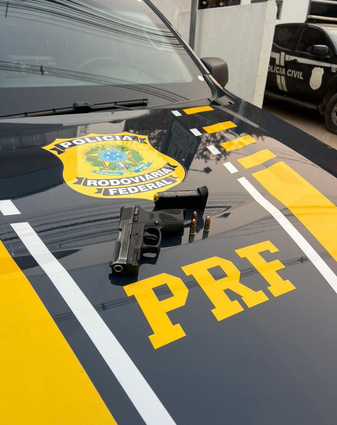 Na segunda-feira (26), uma equipe da Polícia Rodoviária Federal (PRF) durante uma fiscalização de rotina no km 296 da BR-364, no município de Brasiléia/AC, apreendeu uma pistola calibre 9mm e um carregador municiado com três munições intactas.
