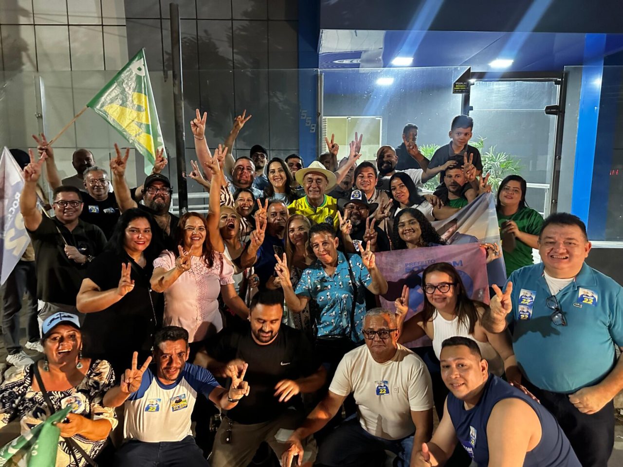 Aos gritos de “É 22”, dezenas de populares festejaram junto ao atual prefeito e candidato à reeleição.