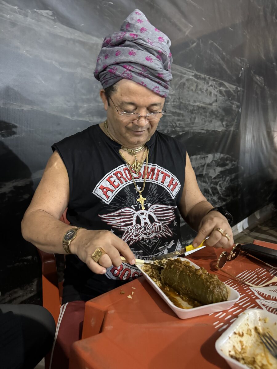 Wanderley, que já havia declarado seu amor pelo famoso charuto de couve com arroz e carne – um dos pratos mais tradicionais da culinária acreana –, fez questão de experimentar novamente a iguaria. Acompanhado do jornalista Douglas Richer, ele visitou diversos estandes gastronômicos da Expoacre e fez uma pausa para saborear o prato.