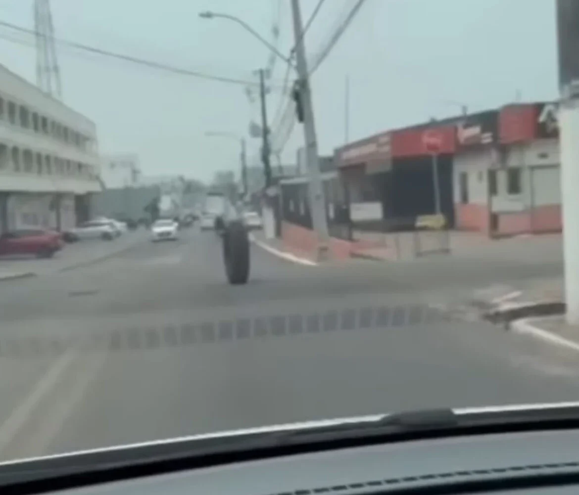 Desgovernado, o pneu quase atinge motociclistas, que conseguem desviar do objeto. O pneu só para quando atinge a porta de um carro, que estava estacionado em uma galeria.