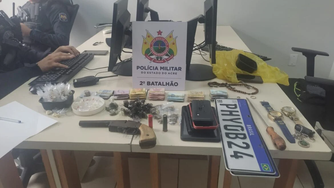 Os policiais realizaram buscas nas proximidades e observaram um apartamento com a porta aberta. No seu interior, havia uma bolsa com vários objetos à mostra, iguais aos que foram levados no assalto. Ao adentrarem o local, os militares localizaram o terceiro indivíduo, que estava com a arma de fogo utilizada no crime, além de entorpecentes.
