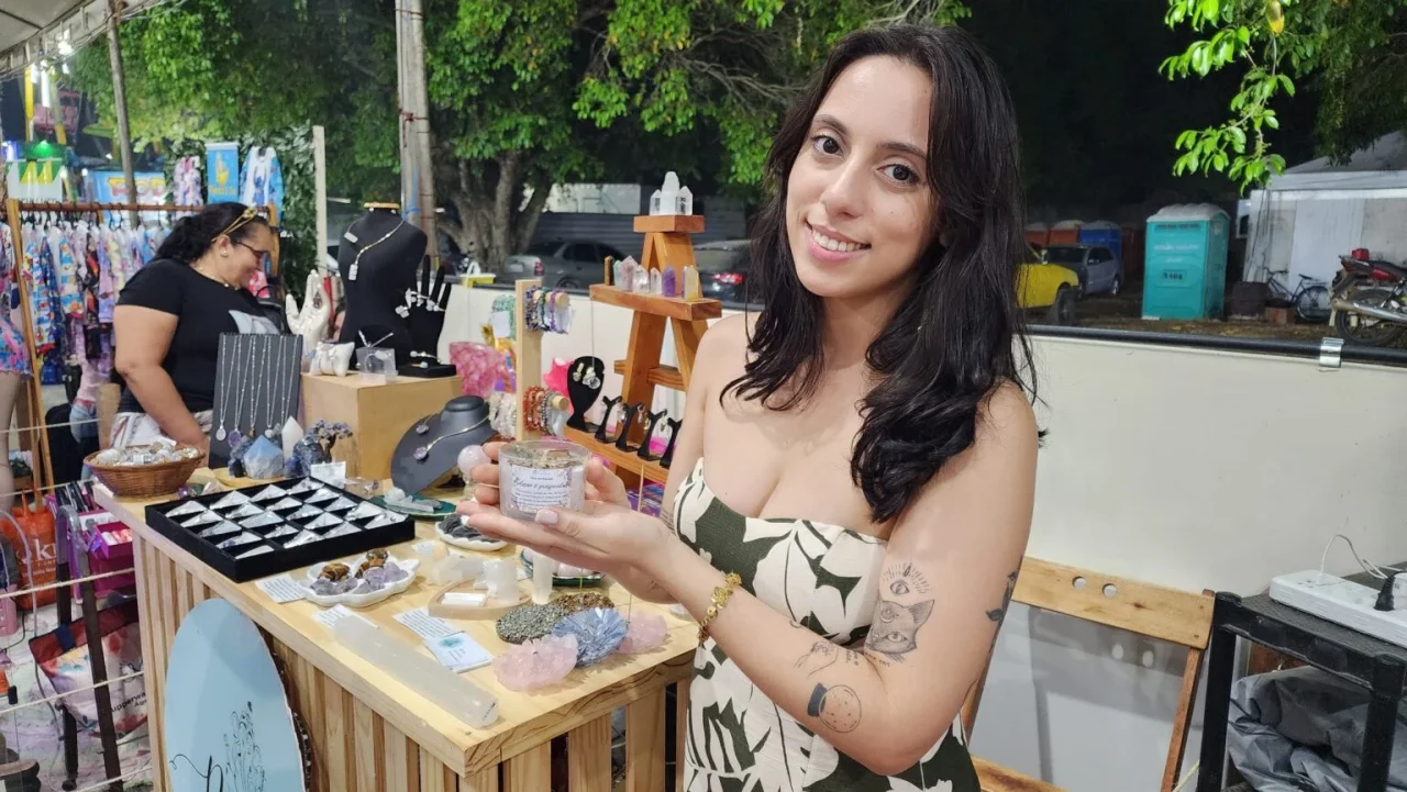 Com uma loja voltada para a sabedoria e magia ancestral, Emmanuelle traz para a Expoacre diversos cristais para vender. Dentre os produtos com os cristais, há pulseiras, colares, brincos, braceletes e até mesmo incensários.