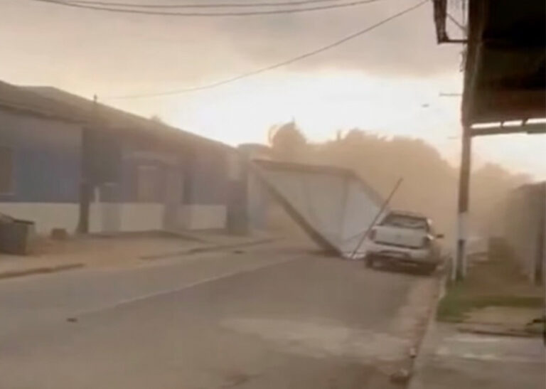Segundo as imagens, com os fortes ventos que atingiram a cidade, vários materiais foram arrastados, incluindo uma tenda que caiu na rua, quase atingindo um veículo que estava estacionado. Mesmo com o susto e os prejuízos possíveis com o fenômeno, não ocorreram relatos de feridos.