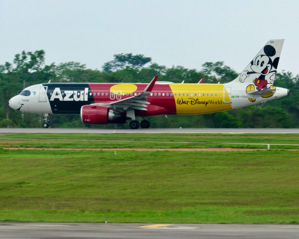 Airbus A320Neo da Azul Linhas Aéreas com pintura temática do Mickey Mouse pousa no Aeroporto Internacional de Rio Branco, Acre/Foto: Daniel Luz/@danielfsl