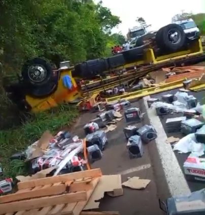Veículo tombado na BR-364 após acidente fatal envolvendo caminhão de baterias automotivas/Foto: Reprodução