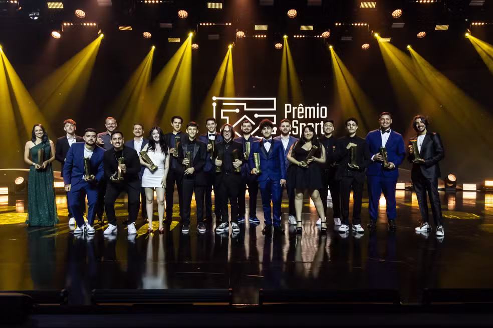 Vencedores posam com troféus no palco do Prêmio eSports Brasil 2023 — Foto: Divulgação/Prêmio eSports Brasil