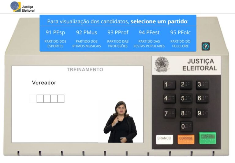 Os partidos e candidatos disponíveis no simulador são fictícios. Para começar, selecione a opção “Votando no 1º Turno” nas eleições municipais e escolha se deseja receber instruções em áudio durante a votação. Após isso, clique no botão “Confirma” (verde) para iniciar.