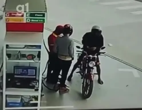 O assalto aconteceu na última quarta-feira (2) e foi registrado pela câmera de segurança do local. As imagens mostram que um dos homens puxa um objeto, que de acordo com a Polícia Militar, é um simulacro de arma, e aponta para o frentista.