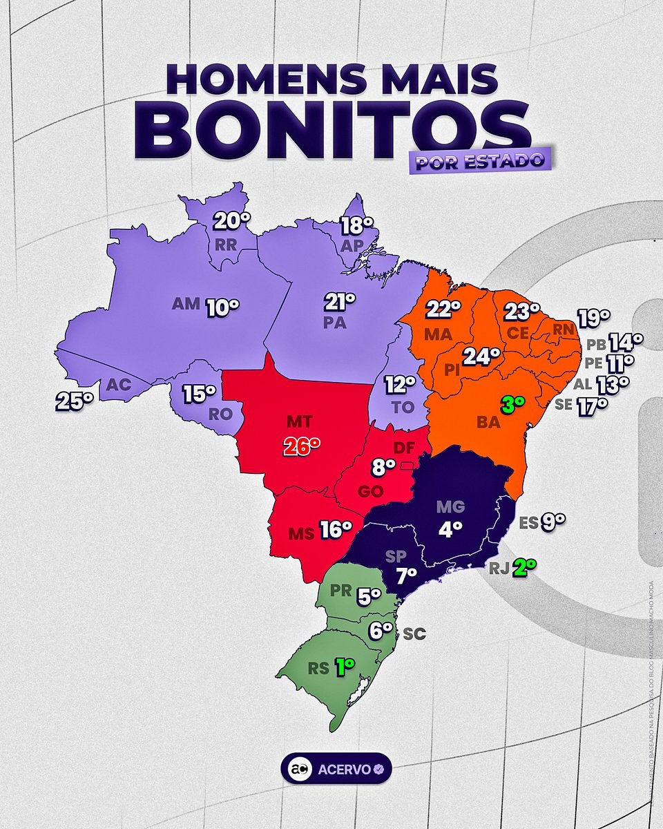 O portal Acervo Charts do X, antigo Twitter classificou a beleza dos homens nacionalmente, rankeando os estados do Brasil. O Acre ficou em penúltimo lugar na lista, ficando na frente apenas do Mato Grosso.