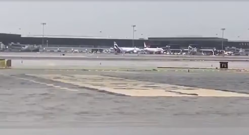 Pista de aeroporto internacional de Barcelona “vira rio” após chuvas torrenciais causarem enchentes em 4 de novembro de 2024. — Foto: Viral Press via Reuters