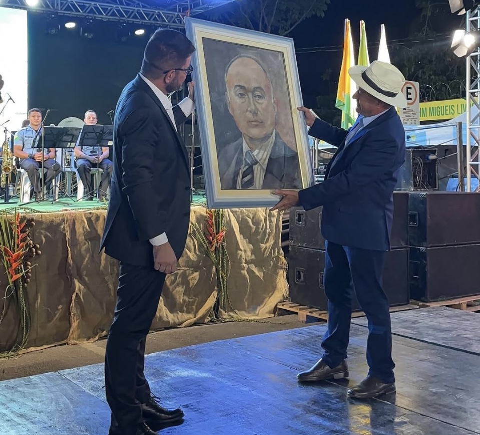 O prefeito de Rio Branco, Tião Bocalom foi homenageado pelo artista plástico Jorge Rivasplata, que morreu aos 90 anos em 2024, e deixou uma obra que foi entregue na noite desta sexta-feira (22), pelo governador Gladson Cameli, durante o evento que elegeu o hino da capital acreana.
