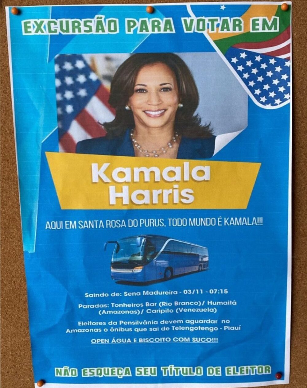 Um cartaz publicado em um mural da Universidade Federal do Acre (Ufac) viralizou nas redes sociais. A brincadeira anuncia uma excursão para quem deseja votar na atual vice-presidente dos Estados Unidos, Kamala Harris, na disputa presidencial deste ano.