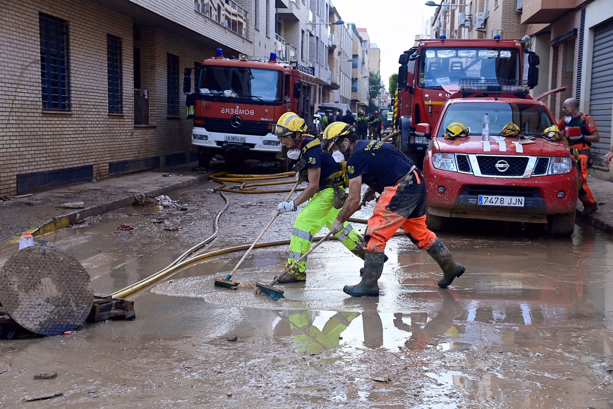 Bombeiros limpam uma rua lamacenta em Sedavi, ao sul de Valência, leste da Espanha