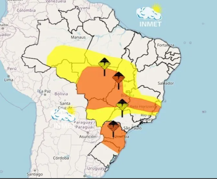 Os estados de Mato Grosso e Paraná devem ser os mais afetados. Um mapa do Inmet mostra a marca laranja que representa a área com previsão para temporais.