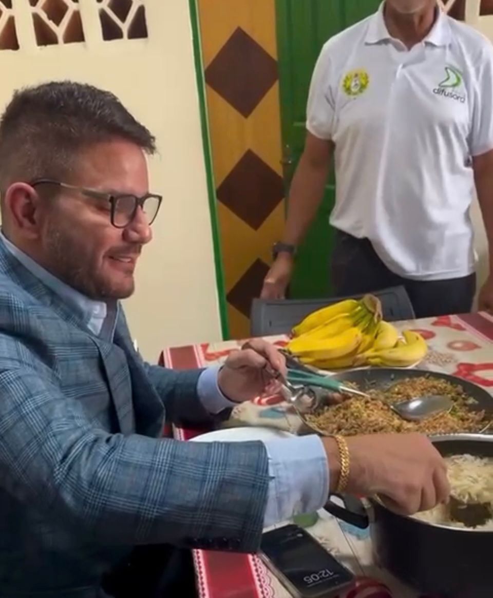 Ao som de música sertaneja, Gladson Cameli come farofa de conserva após entrevista em rádio de Rio Branco. Foto: ContilNet