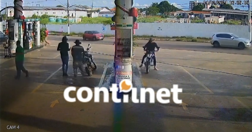 O criminoso aborda o primeiro entregador e pega a chave da moto. Em seguida, outro assaltante toma o dinheiro do frentista e aborda um cliente que estava abastecendo, roubando também a moto dele. A motocicleta do primeiro entregador não dá partida, e o criminoso segue em direção a outros clientes, roubando outra moto. Depois disso, os dois fogem do posto em direção ao Centro de Rio Branco.