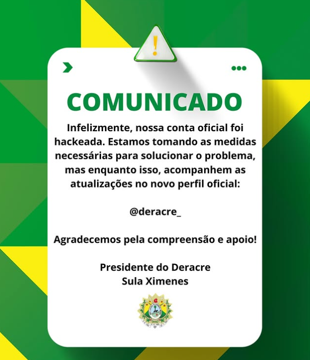 Nota oficial: “Infelizmente, nossa conta oficial foi hackeada. Estamos tomando as medidas necessárias para solucionar o problema, mas enquanto isso, acompanhem as atualizações no novo perfil oficial: @deracre_. Agradecemos pela compreensão e apoio! Presidente do Deracre, Sula Ximenes.”