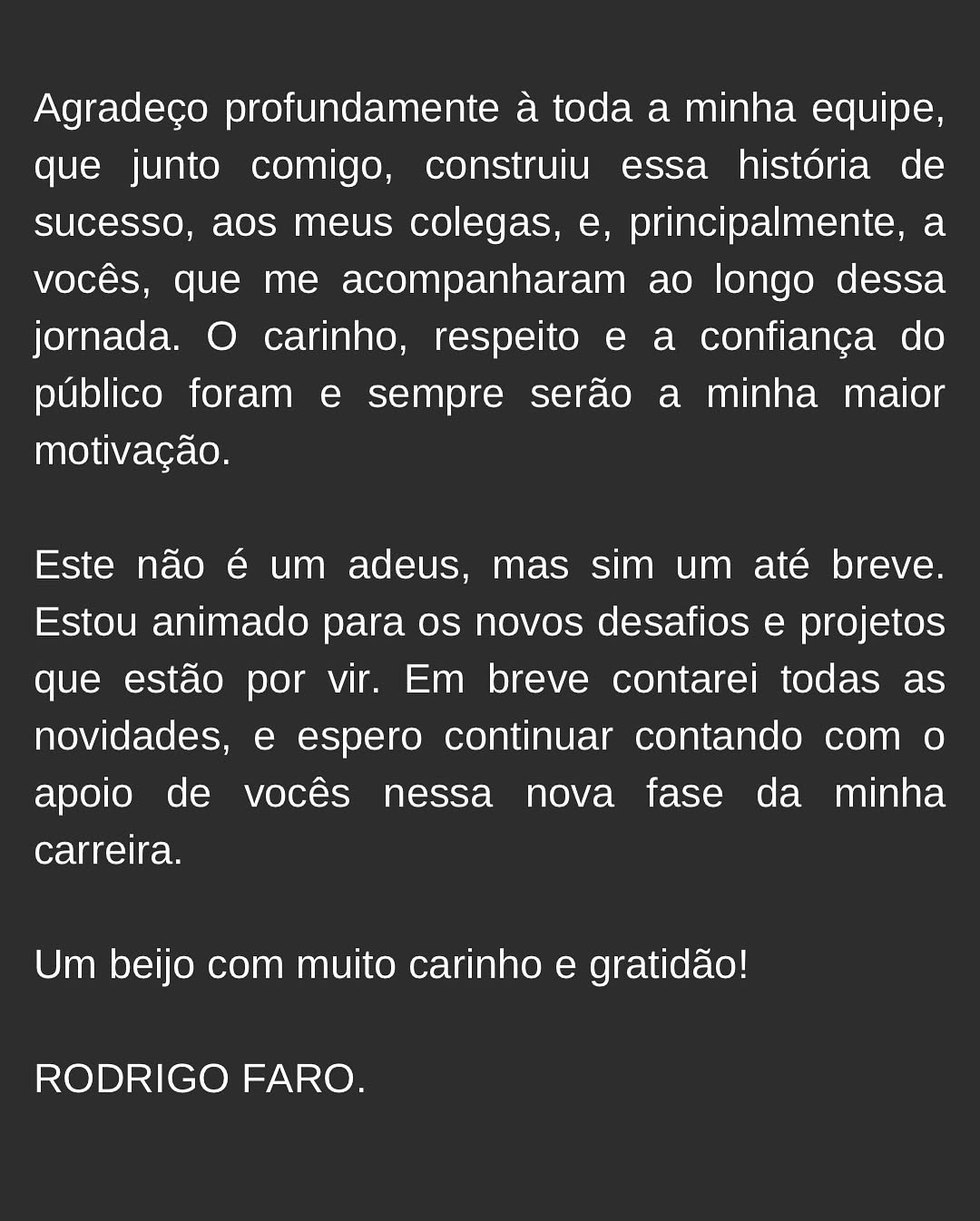Na manhã desta quinta-feira (05), Rodrigo Faro anunciou o encerramento de seu contrato com a Record, após 16 anos de parceria. A decisão foi tomada de forma mútua. O apresentador, aliás, já estava afastado da TV para acompanhar sua esposa, Vera Viel, no tratamento contra um tumor na coxa.