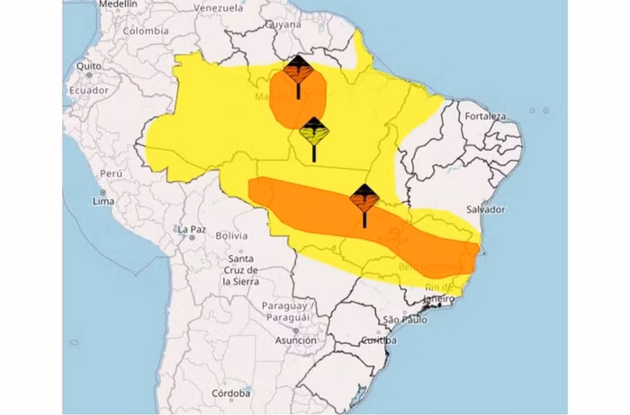 De acordo com o órgão, os estados que sofrerão influência do aviso de “Perigo”, na cor laranja, são: Amazonas, Bahia, Espírito Santo, Goiás, Mato Grosso, Minas Gerais, Pará e Rondônia, além do Distrito Federal.