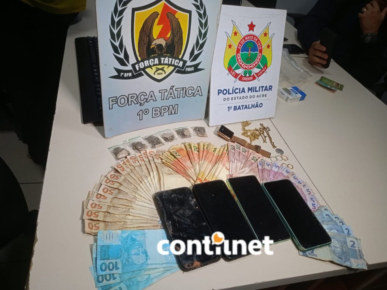 Jhon William de Oliveira Cavalcante, de 22 anos, Luís Felipe Passos da Silva, de 26 anos, Jardson Queiroz de Souza, de 23 anos, João Paulo Lacerda Muller, de 23 anos, e Absolon Leal de Carvalho Junior, de 18 anos, foram presos suspeitos de tráfico de drogas na noite desta terça-feira (14), na Rua Habitat Brasil, no bairro Pista, região da Baixada da Sobral, em Rio Branco.
