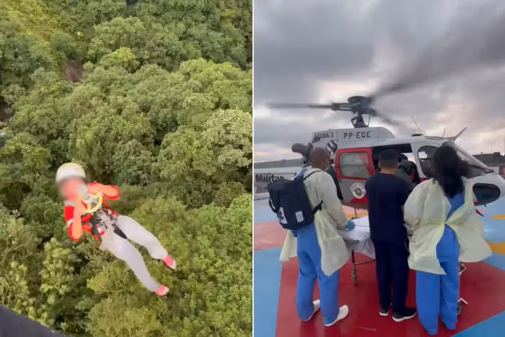 Uma criança de 6 anos foi resgatada pelo helicóptero Águia da Polícia Militar (PM) de uma cachoeira em Praia Grande, na Baixada Santista, litoral de São Paulo, com queimaduras no rosto, mãos e pés.
