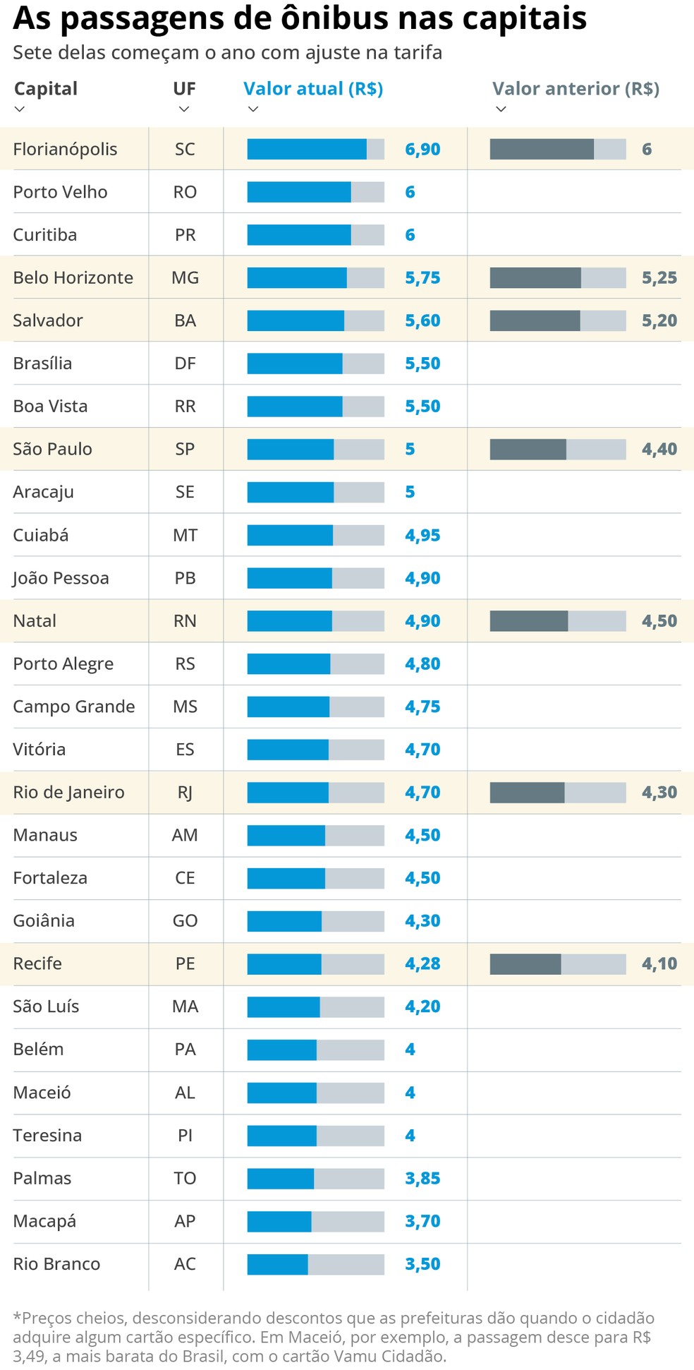 Apesar de a maior parte das capitais brasileiras subsidiar o sistema de ônibus para evitar aumentos superlativos na tarifa, ao menos sete delas começam o ano com reajustes no valor da passagem. Entre as 26, Florianópolis é a que tem a tarifa mais cara e uma das que apresentaram maior aumento neste começo de ano — R$ 0,90. O segundo e o terceiro lugares ficam com Porto Velho e Curitiba, municípios que não tiveram reajuste ainda e seguem com valor na faixa dos R$ 6. Rio Branco, por sua vez, conta com a passagem mais barata: R$ 3,50. (Confira ranking de preços no infográfico abaixo)