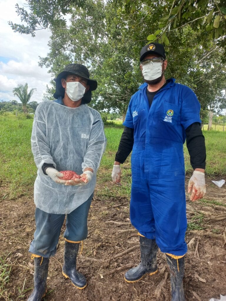 Técnicos do Instituto de Defesa Agropecuária e Florestal do Acre (Idaf) realizaram a coleta de amostras de tecido nervoso de um cavalo com indícios de raiva dos herbívoros nos municípios de Tarauacá e Feijó. A ação ocorreu no sábado (4), na região do Seringal Itamaraty, Rio Murú, zona rural de Tarauacá. Essa medida faz parte dos protocolos de segurança estabelecidos pelo Ministério da Agricultura, Pecuária e Abastecimento (Mapa), por meio do Programa Nacional de Controle da Raiva dos Herbívoros (PNCRH).