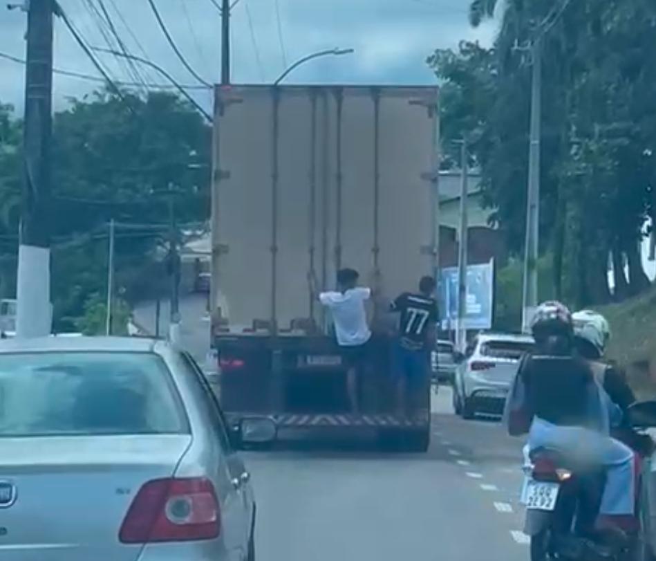 Dois adolescentes foram flagrados em uma situação de risco, nesta quinta-feira (23), ao se pendurarem na traseira de uma carreta em movimento, na Avenida Boulevard Thaumaturgo, em Cruzeiro do Sul.