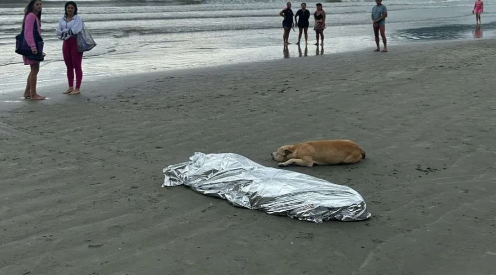 Uma foto mostra um cachorro deitado ao lado do corpo de um homem de 39 anos que foi encontrado morto no sábado (22), em uma praia de Balneário Camboriú (SC).