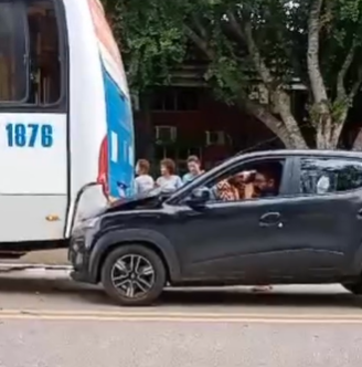 Imagens mostram o carro com a parte frontal danificada e o ônibus parado na via. . O acidente afetou o deslocamento de estudantes e funcionários, causando congestionamento na área interna da instituição.