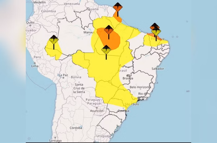O alerta de maior intensidade encobre parte do Norte e Nordeste do Brasil. Nessas regiões, apenas Amapá, Amazonas, Ceará, Pará, Piauí e Rio Grande do Norte serão afetados pelas manchas de coloração laranja.